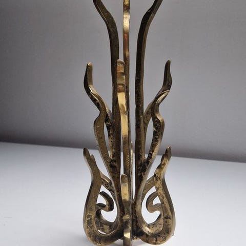Bronzegirandole i patineret bronze med glaskugler, fremstillet i Frankrig, fra 1960–1970, 65 cm høj og 34 cm i diameter, beregnet til seks lys, komplet og i god brugte stand med mindre alderstegn. Klik på den blå "gå til varen" knap, for at købe eller byde på denne vare. Den samlede pris vil blive vist inden du afgiver dit bud.