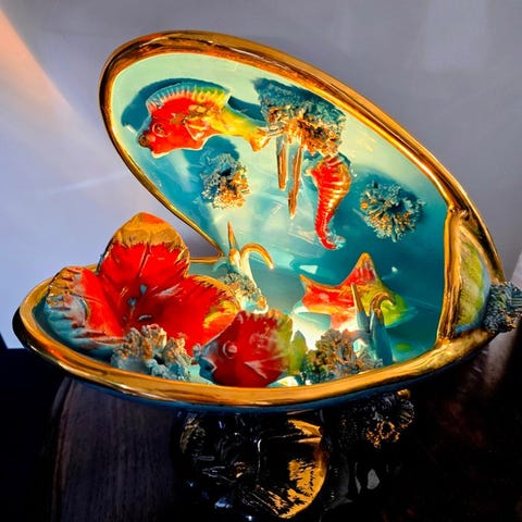 Indeni skallen spiller kompositionen tre farverige fisk, der svømmer blandt koraller og anemoner, alle fremhævet med levende glasurer og gildede dekorative detaljer typiske for Vallauris-produktion fra