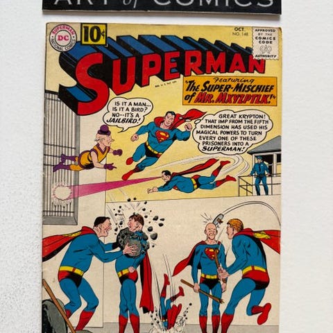 Giant Superman Annual, første udgave fra DC Comics, tegneserie med Curt Swan, nr. 4, hæftet binding, én genstand, i meget god stand, fra 1961. Klik på den blå "gå til varen" knap, for at købe eller byde på denne vare. Den samlede pris vil blive vist inden du afgiver dit bud.
