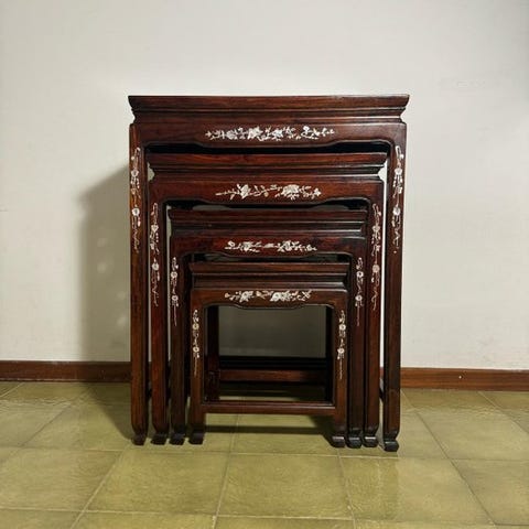Antikt kinesisk foldestolstype Jiaoyi 交椅, også kendt som ceremonielt foldestol med en buet ryg, tilhørende klassiske møbelformer i kinesisk design beregnet for personer af høj social rang. Objektet er udført i hårdt tæt træ, formentlig huanghuali, værdsat i Kina for holdbarhed, smukt årring og prestigiøst karakter.