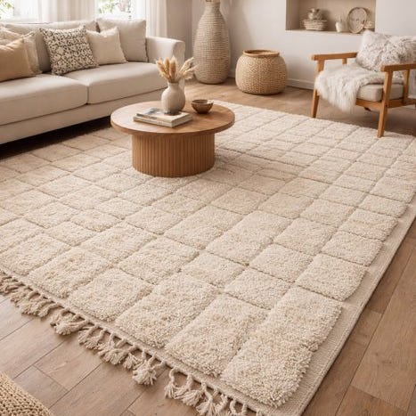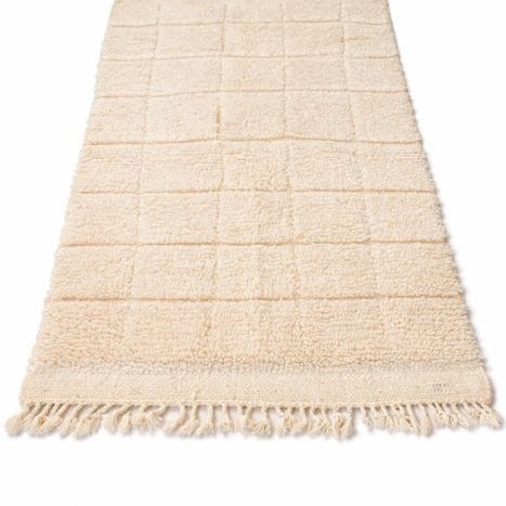 Direkte fra Atlasbjergene kommer dette unikke, håndknyttede Berber-tæppe af ren uld på en robust bomuldsbund. Et tidløst kunstværk på 302 x 220 cm, hvor tradition, symbolik og sjæl mødes.