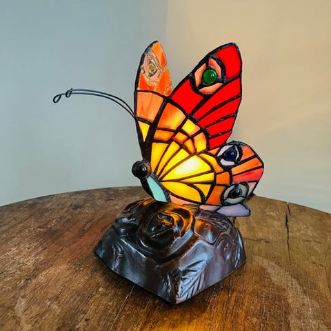 Oplys dit rum med et strejf af elegance og eksklusivitet! Denne smukke Tiffany-lampe, håndlavet, er inspireret af designet "Dragonfly" fra Tiffany Studios New York, et ægte blikfang i ethvert indretningsrum.