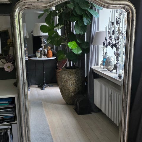 Antikt spejl i Luigi Filippo-stil med mørtel i bladguld, af valnødtræ, produceret i Italien (Lombardiet), ca. 1850–1900, ydre mål 90 × 70 cm med 3 cm dybde, indlagt varslet indviklet ramme, i god brugt stand med mindre aldersrelaterede mærker. Klik på den blå "gå til varen" knap, for at købe eller byde på denne vare. Den samlede pris vil blive vist inden du afgiver dit bud.