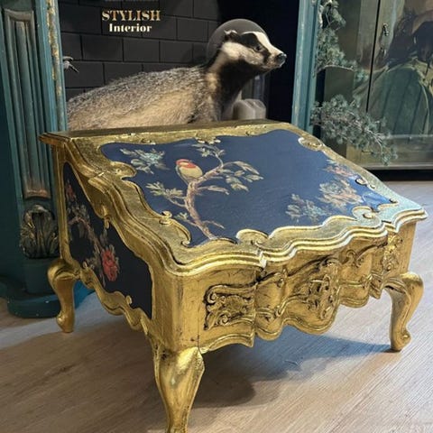 Den bløde pudderrose nuance kombineret med elegante gyldne accenter får den til at stråle i ethvert rum. De smukke gyldne blomster sammen med de farvede blomster på siderne giver den et strejf af barok, et nip glamour og især: rigtig meget karakter.
