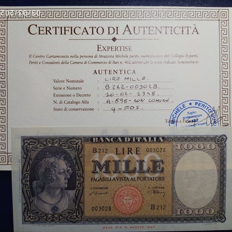 Italiensk 1000 lire-seddel, dateret 29.06.1926, Gigante BI 42N, tilstand som på billedet. Klik på den blå "gå til varen" knap, for at købe eller byde på denne vare. Den samlede pris vil blive vist inden du afgiver dit bud.