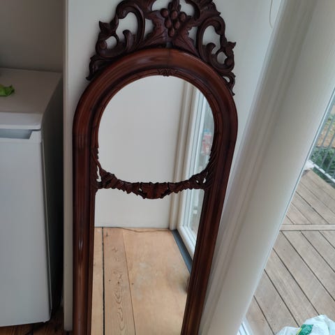 Træspejl af italiensk oprindelse, i god brugssituation med mindre aldersmærker og pletter; ydre mål 31 × 61 cm, spejldimensioner 12 × 30 cm, cirka 1940–1950. Klik på den blå "gå til varen" knap, for at købe eller byde på denne vare. Den samlede pris vil blive vist inden du afgiver dit bud.