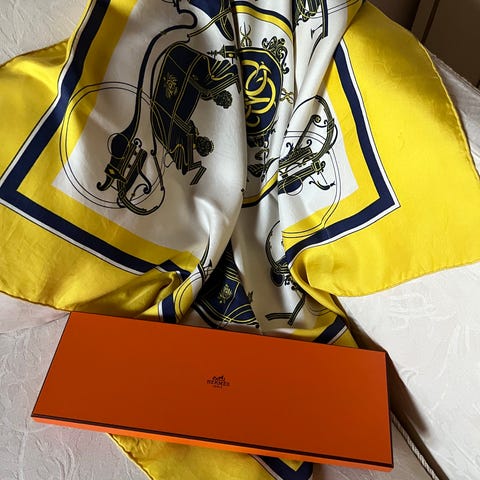 I en meget god vintage tilstand, en vidunderlig chic silkesjal fra det franske modehus Hermès, inklusive den gamle originale orange papiremballage (nu en kartonboks), med deres adresse 24, Rue du Faubourg Saint-Honoré i Paris. Denne silkesjal blev produceret i begyndelsen af 1970’erne.