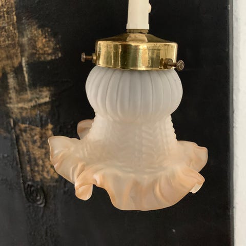 Fantastisk og nostalgisk glas lampet med original messing ophæng og porcelæns fatning