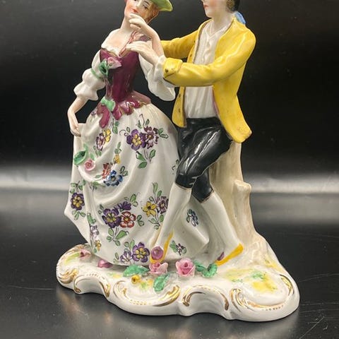 Porcelænsfigur af en siddende ballerina i en lysblå tutu med fine gulddekorationer, der holder et lille spejl i den ene hånd og ordner sit hår med den anden, dateret til 1960–1970 og lavet i Tyskland, mål: 18 cm høj, 9 cm bred, 14 cm dyb, i god brugt stand med mindre aldersmærker og mangler. Klik på den blå "gå til varen" knap, for at købe eller byde på denne vare. Den samlede pris vil blive vist inden du afgiver dit bud.