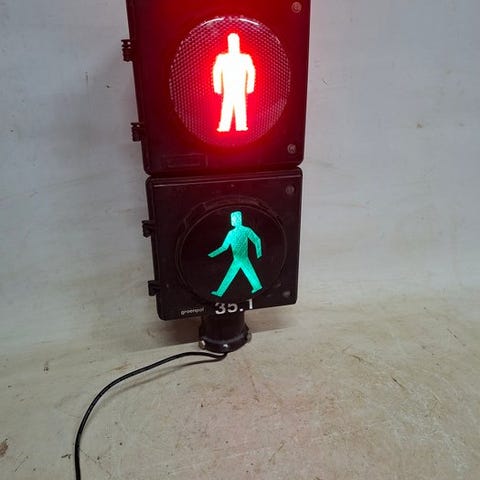 Dette eksemplar, designet til trafikanvendelse, bevarer al fascinerende del af det tekniske objekt fra den tid: solid metalramme lakeret, beskyttelsesvisirer formet og de tre klassiske lyssektioner med fodgængere. Det er blevet omkablet med omhu til civil brug og udstyret med et cirka en meters strømkabel: når den tilsluttes stikkontakten, tændes alle tre lys samtidig – rød, amber og grøn – og skaber en stemningsfuld, varm og markant scenografisk