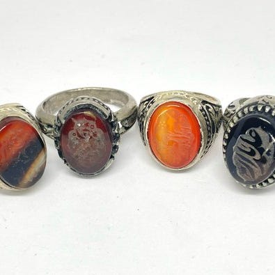 Dette er et sæt af otte (8) agat- og karneol-sten, håndhugget med islamiske talismaniske beskyttelses-symboler og ornamenter. Den største sten er fortifikationsagat, den måler 4,5 x 3,3 cm. Den mindste grønne sten, sandsynligvis mosagat, måler 2,2 x 1,7 cm. Det sidste billede viser størrelsen på hver sten i både centimeter og tommer. Den samlede vægt af alle otte sten er 96 gram.