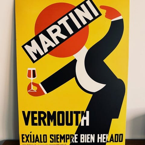 Skarp sort, creme og rød farveskema med attraktivt naturligt krakeleringsoverflade udviklet over tid. Klassisk fransk caféæstetik fra 1950’erne–1960’erne.