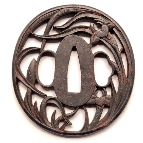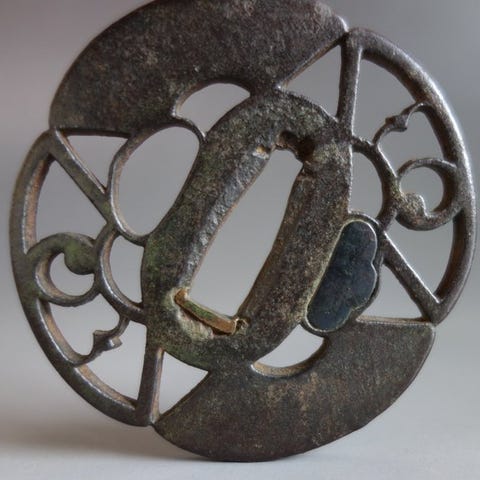 Dette er en jern-tsuba, hvis design er kiku-krysantemum.
