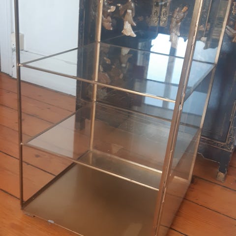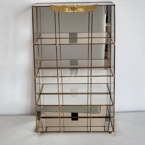 Elegant par vægmontrer i messing og glas, med raffineret design og meget dekorativt. Hvert element har en slank, flere niveauer struktur, ideel til udstilling af små genstande, bibelotter, miniatyrer eller samlerobjekter.