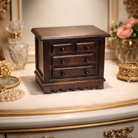 Indvendigt er det foret med rig bordeauxfarvet fløjl. Messinghåndtaget og hængslerne med en let patina fuldender dets vintages æstetik. Nogle slidmærker langs kanterne øger dens autenticitet.