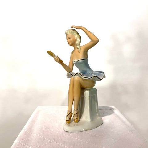 Ridderen bærer en strålende gul jakke, og danse-danseren en hvid blomsterkjole malet i hånden, en vinrød bodice og en grøn hat. Den samlede komposition hviler på en rocaille-base med hvide krummelurer, forgyldt i guld.