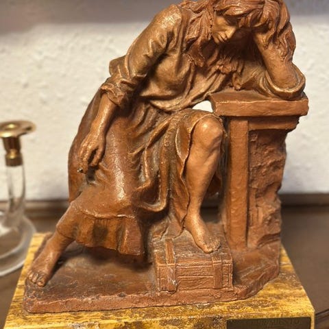 Elegant moderne kunstnerisk skulptur, der repræsenterer en kvindelig figur i en introspektiv holdning, knæende og med en flydende og harmonisk komposition. Stykket udmærker sig ved sine stiliserede linjer og sin minimalistiske æstetik, der formidler ro og balance.