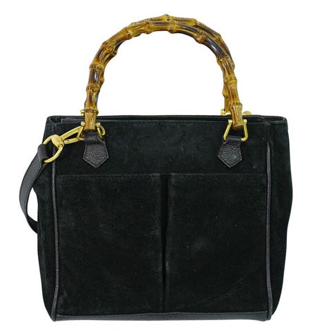 Gucci Bamboo-rygsæk, en vintage lædergenstand i sort. Et ikonisk design med en frontklap og to forlommer med spænder i naturligt bambus, buet af varmebehandling, et karakteristisk kendetegn ved mærket. Det primære lukke-system kombinerer et justerbart lædersnor med en metallisk spænde for øget sikkerhed. Den stive øverste bambushåndtag og hardware i gylden tone, inklusive en indvendig lynlåstrækker med firmaets cirkulære medaljon. Indersiden har autenticitetsstemplet "Gucci Made in Italy" indgraveret på en gylden plade.