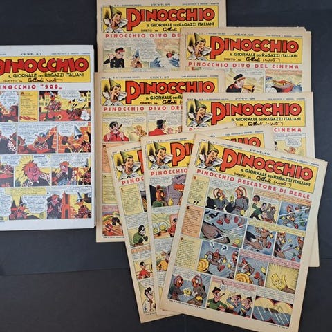 Første udgave 1934, Pinocchios eventyr af Piero Bernardini, hardcover-udgave fra Albin Michel på fransk med farveillustrationer i og uden for teksten, 238 sider, format 27,5 × 22 cm. Klik på den blå "gå til varen" knap, for at købe eller byde på denne vare. Den samlede pris vil blive vist inden du afgiver dit bud.