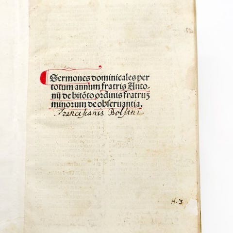 Rart incunabulo af Sermones Quadragesimales de Peccatis af den berømte franciskanske predikant Roberto Caracciolo, trykt i Lyon i 1488 af Mathias Huss for Lodovicus de Venetia. Værket indsamler et bredt skema af quaresimale prædikener dedikeret til synden, til bod og til moralsk omvendelse, og udgør et af de mest effektive eksempler på senmiddelalderlig homiletik. I det 15. århundrede udgør prædikenen et af de vigtigste religiøse dannelsesværktøjer i bysamfundene, og trykte prædikener blev