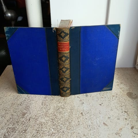 Sort klapæske med gyldent titeltryk på ryggen. Fuldt læderbind med gyldent titeltryk og udsmykninger på ryg og omslag. Alle kanter forgyldede, inderkant. Forsideindstik med bogplate af Eugene Le Harival Perrot og Kenneth Monkman ved Shandy Hall. Blyantnotat til første blanke blad. Titelbladet gravure, teksten med 12 separate daterede titelblade. Let marginalsænk ældningstoning, ellers er siderne generelt meget rene, som vist.