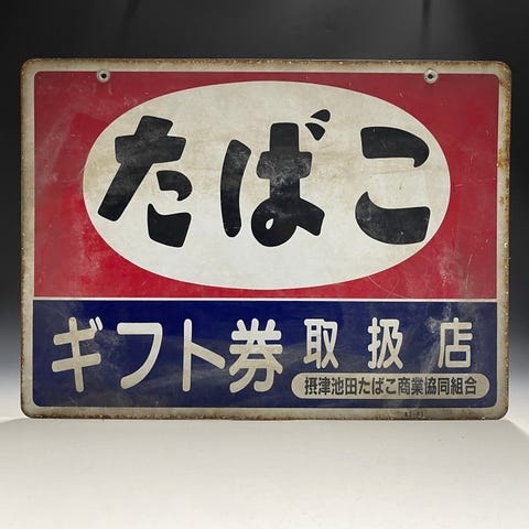 Genoplev den livlige Showa-tid i Japan med dette iøjnefaldende dobbelt-sidet emaljeskilt, der præsenterer det markante ord "Tobacco Kyoto". Annoncen "Gift shop" har også et designelement.