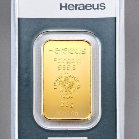 Argor-Heraeus Kinebar guldbaar på 20 g, fineness 999,9, LBMA-certificeret, forseglet med certifikat, oprindelse Schweiz, i blisterpakning. Klik på den blå "gå til varen" knap, for at købe eller byde på denne vare. Den samlede pris vil blive vist inden du afgiver dit bud.