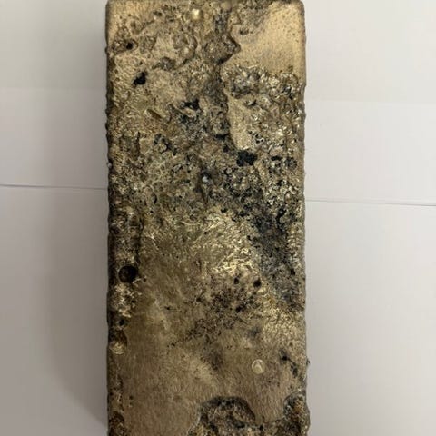 Identifikation: Baren bærer navnet og logoet af Umicore, vægt, renhed og et unikt serienummer (087275) hældt på overfladen