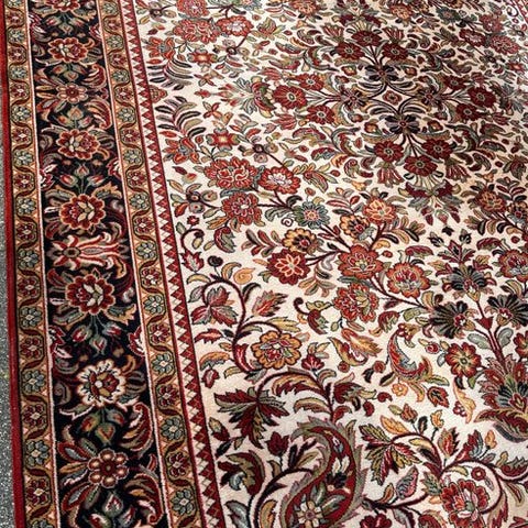 Beskrivelse: Stor dekorativt tæppe i klassisk persisk design med et centralt medaillon og rig blomsterornamentik. Farverne er levende og velafbalancerede, med en stærk visuel tilstedeværelse der egner sig til store rum.