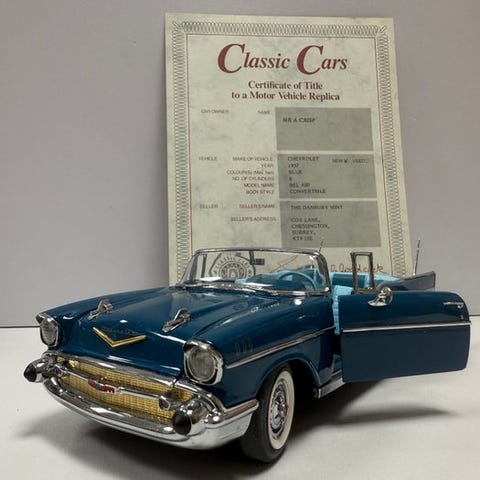 Franklin Mint 1:24 skala diecast-model af en Chevrolet Bel Air Cabriolet 1956 i grøn, mint tilstand med original æske. Klik på den blå "gå til varen" knap, for at købe eller byde på denne vare. Den samlede pris vil blive vist inden du afgiver dit bud.