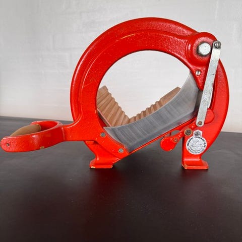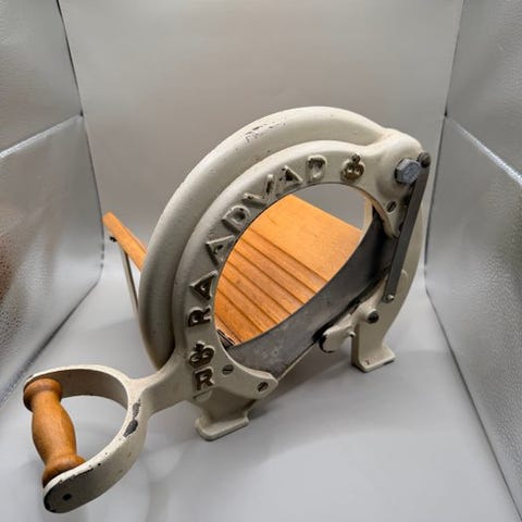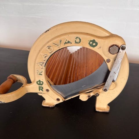 Flot dansk vintage brødskærer i original orange farve. Den orange Raadvad brødskærer (Model 294 – den klassiske runde rammedesign) blev produceret fra slutningen af 1940’erne til 1970’erne. Den lyse orange finish er særligt karakteristisk for 1960’erne og 1970’erne, hvor dristige farver blev populære i nordiske køkkener. Baseret på designet og farven daterer dette eksemplar sig sandsynligvis til omkring 1960–1975.