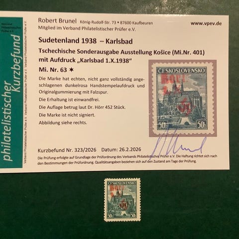 Oprindelse: Bøhmen og Mähren; Karlsbad: 40 Heller med 'wir sind frei' overtryk, Michel 6; ubrugt (MH), med certifikat, oplag 410 frimærker. Klik på den blå "gå til varen" knap, for at købe eller byde på denne vare. Den samlede pris vil blive vist inden du afgiver dit bud.