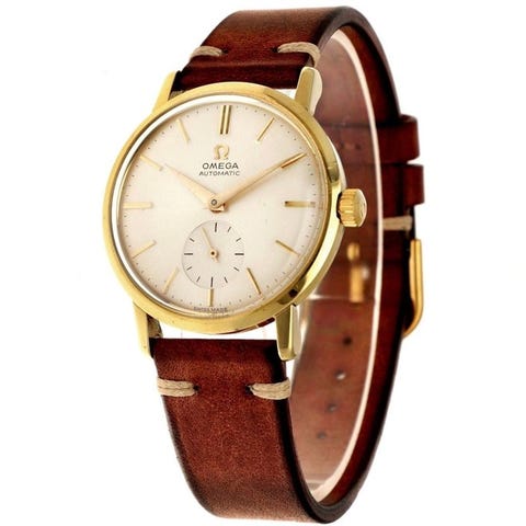 Heuer kronograf i 18 K guld, reference 75350, Valjoux 23-urværk, kasse i gult guld 35 mm, læderrem, manuel wind, periode 1960’erne, urskive malet om, i god stand. Klik på den blå "gå til varen" knap, for at købe eller byde på denne vare. Den samlede pris vil blive vist inden du afgiver dit bud.