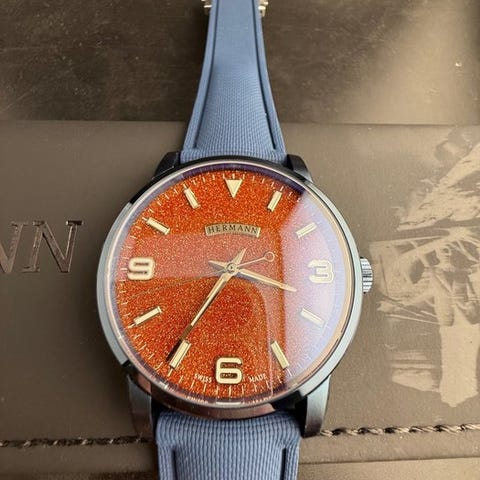 Skive: Blå. Guilloché. Åben. Lille sekund ved 6.