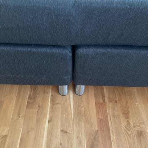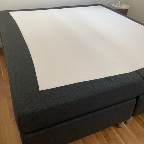 Jysk Dreamzone seng. Sengen består af to sammenstillede underdele med mørkt stofbetræk og runde metalben. Produktet er mærket "Made in Denmark". Betrækket er aftageligt og kan renses efter anvisningerne på mærkaten. Velegnet som dobbeltseng i soveværelse eller gæsteværelse.
