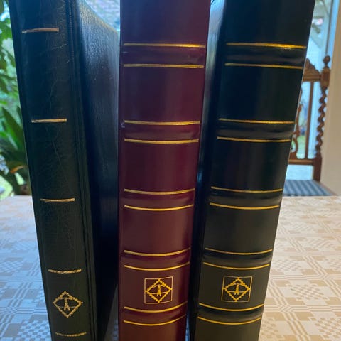 Frimærke ringbind med plastlommer. Sættet består af to album, et brunt og et blåt. Begge album har ringmekanisme indeni og indeholder gennemsigtige plastlommer til opbevaring af fotos eller andre papirer. Velegnet til organisering og opbevaring af billeder, postkort eller samlerobjekter. Farver: brun og blå. Materiale: omslag i kunstlæder/plast med indvendige plastlommer.