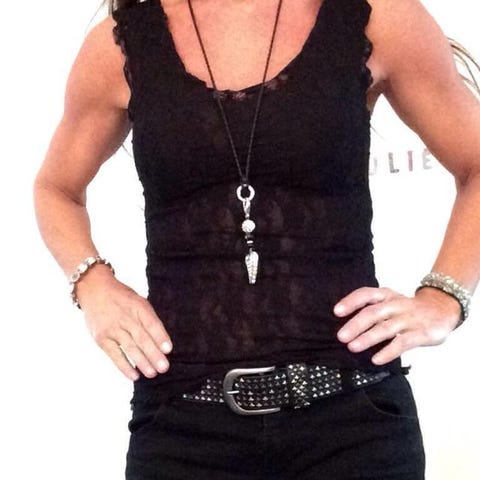 Toppen har brede skulderstropper samt en fin bølget kant i halsrundingen i armrundingen samt i bunden af toppen. Den har det fineste blomstermønster i hvid blød blonde ned små blomster Toppen er lettere stretchy / elastisk, og er designet i 2 lag, så den “kun” syner halvtransparent.