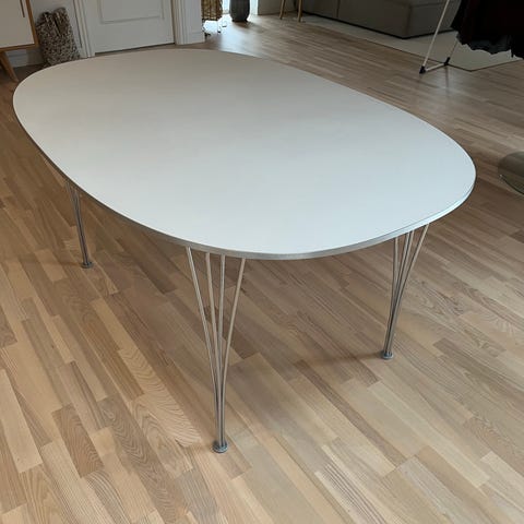 Fritz Hansen bord designet af Bruno Mathsson. Bordet har en hvid, oval bordplade og slanke metalben. Velegnet som spisebord eller arbejdsbord i spisestue, køkken eller opholdsrum. Klassisk skandinavisk design med let udtryk, der passer ind i mange typer indretning.