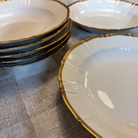 Smukt hvidt porcelæn fra Bing & Grøndahl i stellet Offenbach med fin guldkant. Et klassisk og elegant stel, der passer både til hverdag og gæster.