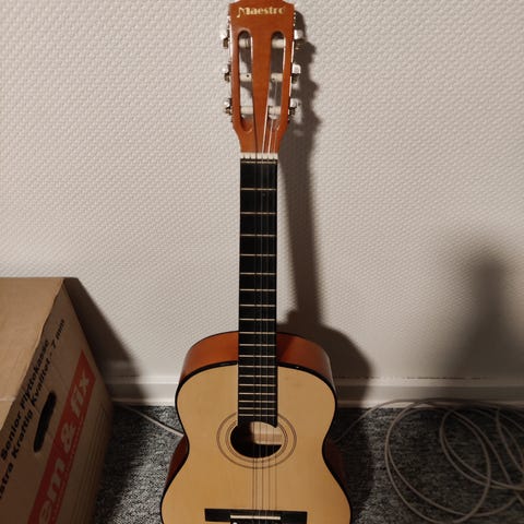 Har denne Guitar fra STARSOUND som fik nye strenge i December 2025. Klassiske SAVAREZ 520R strengesæt. Den har nogle få brugsspor, men er god til nybegyndere.
