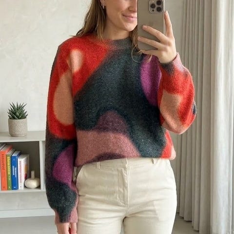 Nümph strik i en farvesammensætning af pink og rød. Strikken er i en blød viscose blanding,, ribkant i bunden og ved ærmerne, og i et ternet mønster med en diskret glimmer tråd i.