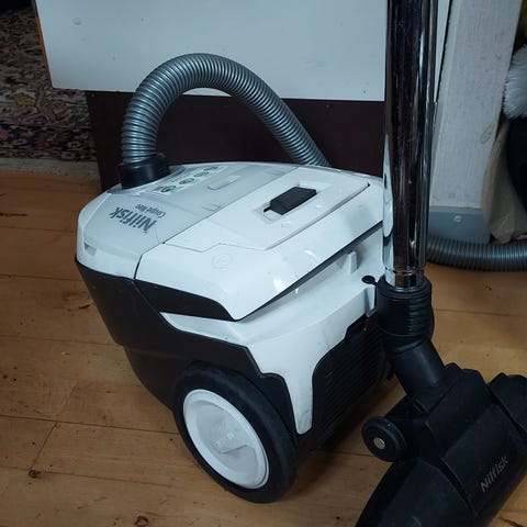 Nilfisk Coupé Neo støvsuger i rød farve. Kompakt model med teleskoprør og fleksibel slange. Anvender støvsugerposer, som ses på billederne. Velegnet til almindelig rengøring i hjemmet, f.eks. hårde gulve og tæpper, afhængigt af den anvendte mundstykke-type. Strømtilsluttet model med betjening på selve støvsugeren.