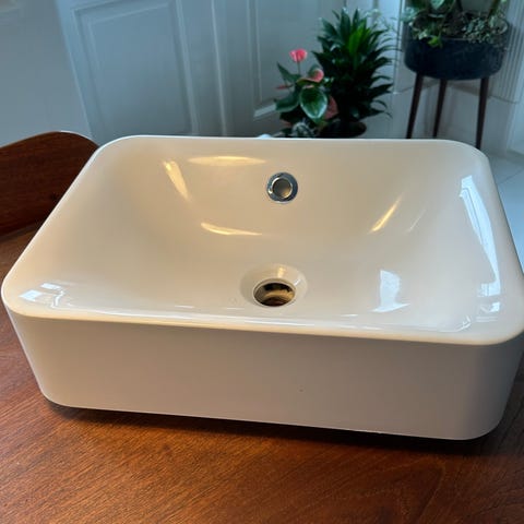 Bath Deluxe håndvask i hvid porcelæn/keramik. Rektangulær model med integreret overløb og hul til armatur. Velegnet til montering på bordplade eller konsol på badeværelse eller gæstetoilet. Standard afløbsudtag i midten af kummen. Armatur og afløb kan tilsluttes efter gængse VVS-standarder.