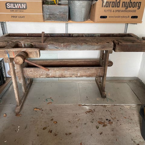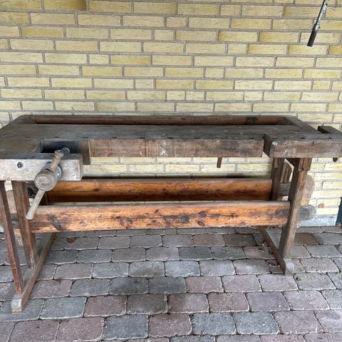 Klassisk snedkerbænk i massivt træ med to integrerede skruetvinger i hver ende. Bænken har kraftig bordplade med udskæringer til værktøj og arbejdsstykker samt solidt understel med tværstivere for stabilitet. Egnet som arbejdsbord i værksted, til træarbejde eller som robust bord i hobbyrum. Overfladen fremstår med brugsspor, som er typiske for en ældre arbejdsbænk i træ.