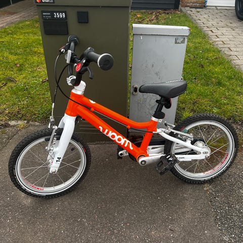 Woom 2 børnecykel med 14" hjul. Cyklen har let stel.