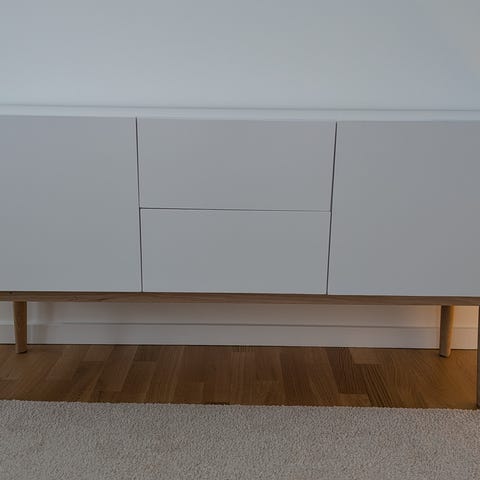 Hvid skænk fra Ilva af mrk. Malibu. Brugt men pæn. Har en lille skramme på toppen. Højde 92 cm, bredde 44 cm, længde 146 cm.