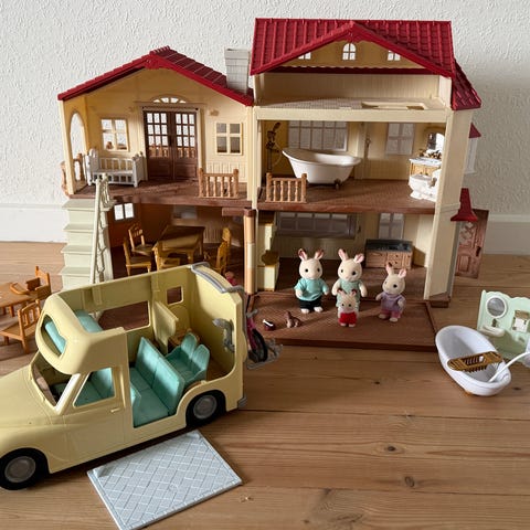 Sylvanian stor kaninfamilie med stort hus, soveværelse, klapvogn og højstol, børneværelse, spisestue, køkken, badeværelse og supermarked. Enkelte mindre dele kan mangle, men det meste er der.