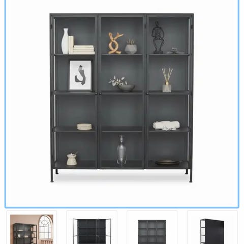 vitrineskab fremstillet af jern med en sortlakeret, patineret overflade, der giver skabet et flot, rustikt look.## Lav 2-dørs vitrine med 3 indvendige hylder i hele skabets bredde samt 4 glaslåger med stift-lukkesystem. Et flot vitrineskab i et råt og industrielt design.
