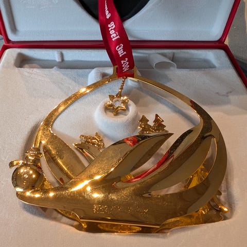 Helt ny og ubrugt, stadig i plastikfolie. Georg Jensen Golden Christmas juleophæng i guldfarvet metal. Julepynt til ophæng på juletræ, grene eller i vindue.