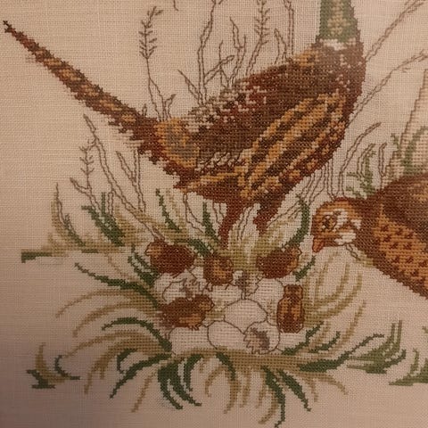150 kr.BRODERET BILLED AF FASANPAR MED UNGER! FLOT BRODERET I KØNNE FARVER !HelsingeFøj til favoritter.